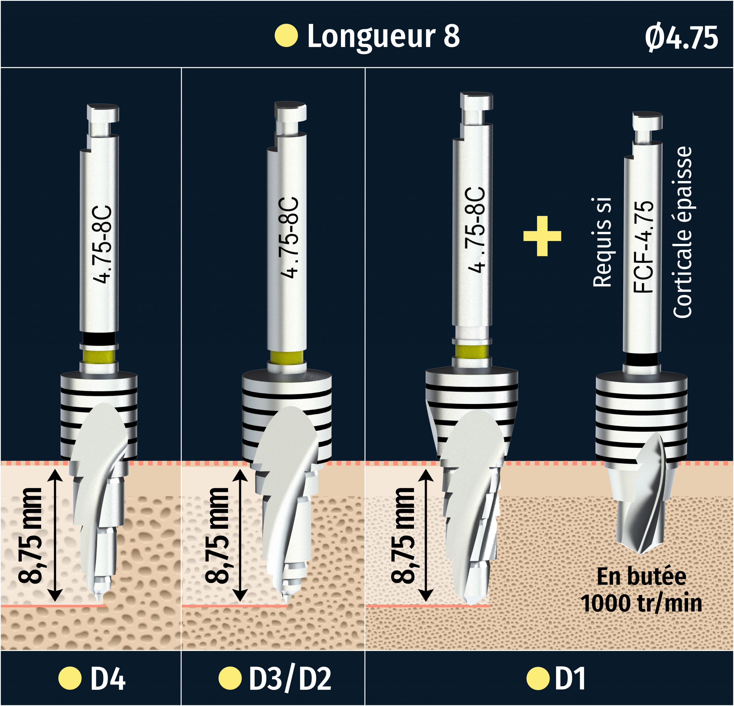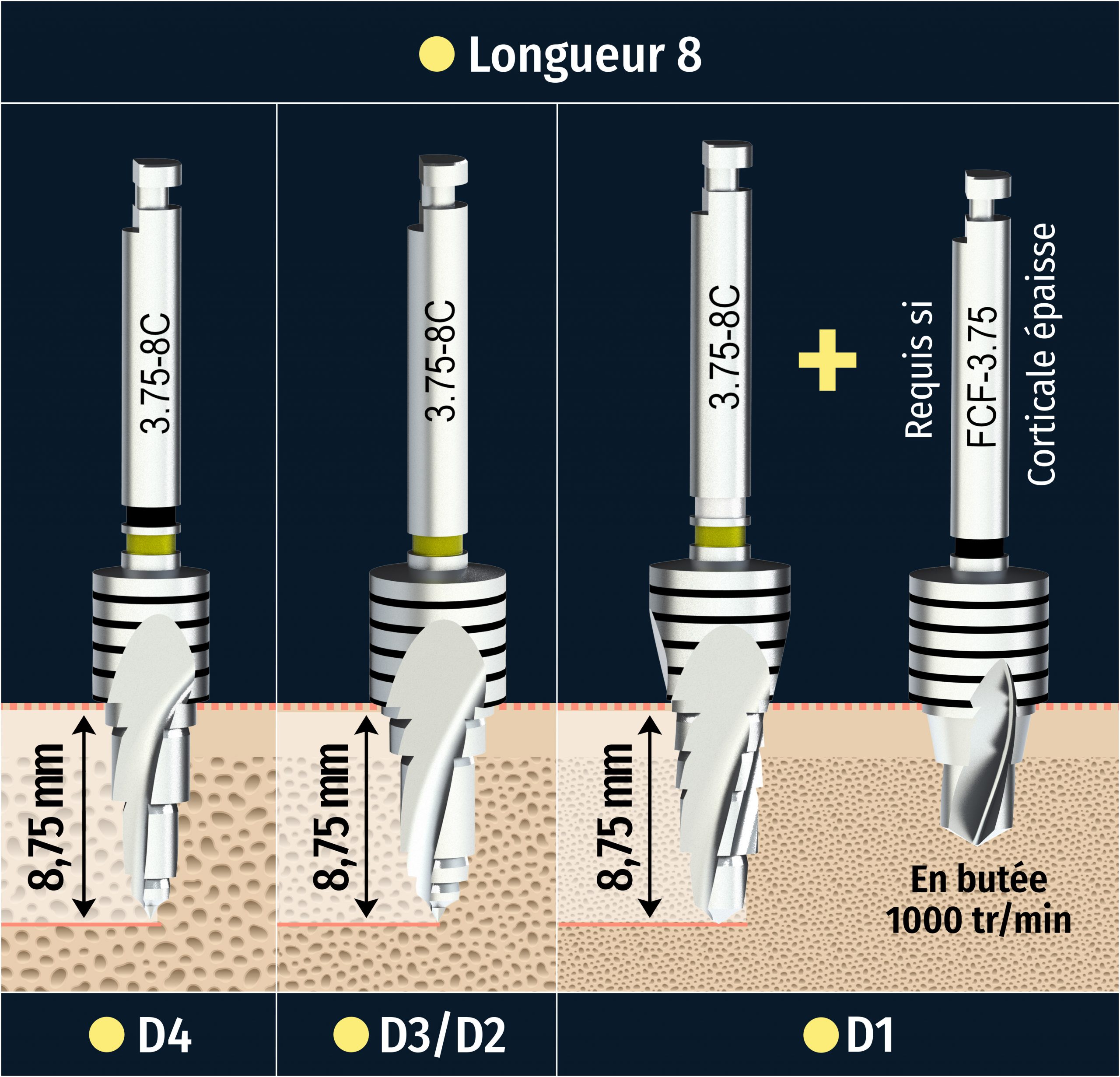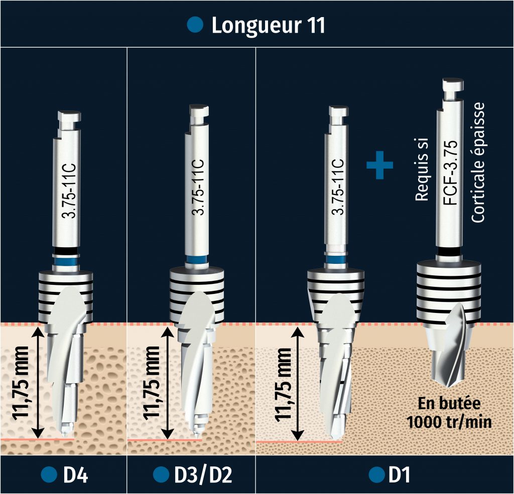 • 1 foret par hauteur d’implant pour les densités osseuses D1, D2/D3, D4 – 1000 tr/min