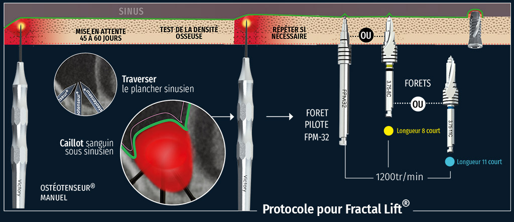 Pour que la technique Fractal Lift® fonctionne, il faut une hauteur d’os initiale supérieure à 4mm (à t = 0). Le passage d’un Ostéotenseur® manuel est essentiel 45 jours avant la pose de l’implant. Cette stimulation ostéogenique active le pool cellulaire endosté et périosté (optimisation de la densité osseuse). La pénétration de la membrane sinusienne aboutit à la formation d’un cal osseux après la fermeture de la membrane (les cellules de la muqueuse respiratoire sinusienne ont un potentiel de cicatrisation rapide en l’absence de pathologie).